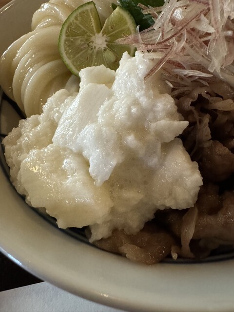 出汁の効いたつゆは味が強すぎず、ミョウガや大葉の風味、すだちの爽やかな酸味でさっぱりといただく事ができ、大きく砕かれた山芋のシャキシャキ感、甘辛く味付けされ口の中で脂がとろける国産和牛など具材とのバランスがとても良いです。