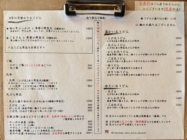 案内していただいたテーブル席に座り、8月の月替わりおうどんの「肉山芋ぶっかけと季節の野菜天」(1,850円)をいただく事にしました。