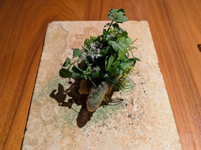 ④天然若鮎のトルティーヤのフリット、鮎肝のソース、実山椒、サラダ仕立て…〇鮎の姿を保っているが、サラダを乗せられて頭だけこちらに出しているので、何だかわからない盛り付け。横から見ればまだましなのだが、客目線の写真を掲載した。