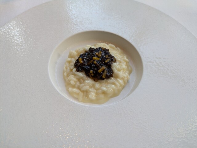 ⑭チーズリゾット by LF、韓国産香茸のソース by SA…コースにはない、即興で両シェフがコラボした一品。