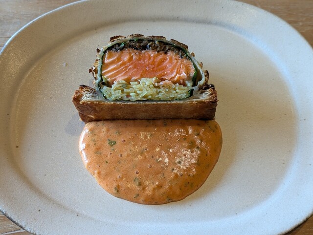 ⑥富士宮産虹鱒のパイ包み焼き、ショロンソース、法連草…〇埼玉県は海なし県なので、魚料理にはシェフの前の店の所在(富士宮市)の虹鱒を使っている。切り分ける前のパイ包み焼きの姿もウリ坊のようで美しく可愛らしいが、切り分けた断面を見ても凝りに凝っていることが窺える。刺身で食べられる虹鱒なので、レアに仕上げている。