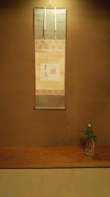 「…お茶席には、すでに一期一会の心入れの準備が整っていて、ほのかなお香のかおりが漂っています。懐石は、このような雰囲気の中で召し上がっていただくのが本来の姿でございます。…喧騒の巷の中に、いささかでも御茶席の趣きを工夫いたし、…献立や持ち出す順序なども、本式の茶懐石に較べますと多少変えてございますが、茶の湯の心を心として謹調させていただいております。」(お店の「御献立のしおり」より抜粋)