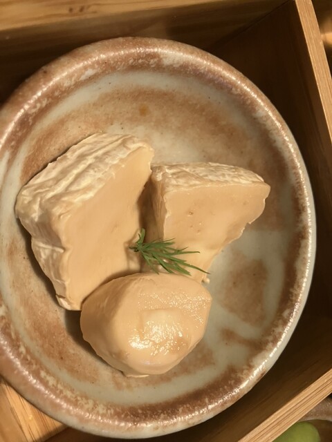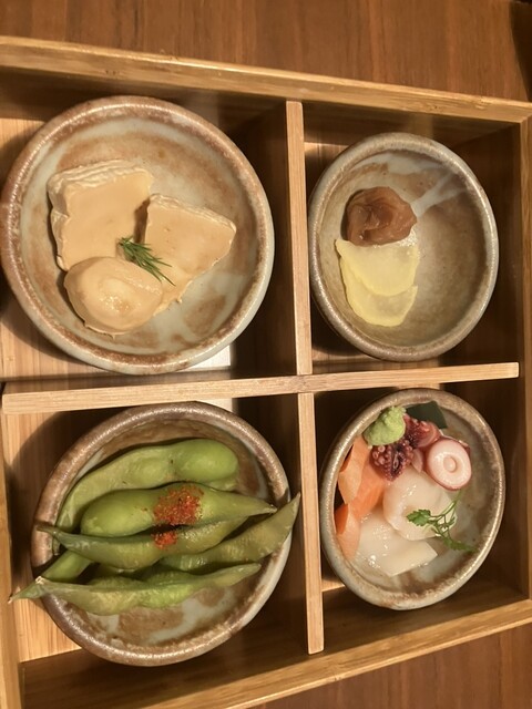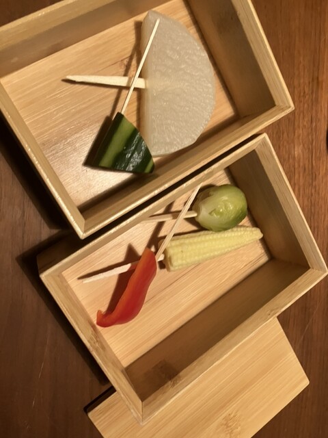 いくつかの木箱があり、その中に前菜など入っています。野菜を味噌でいただいたり、お刺身などありました。どれも素材を生かしたような料理で、おいしかったです。