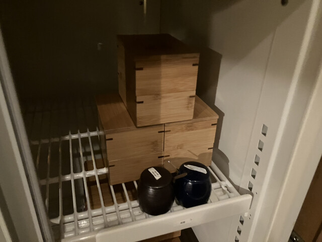 部屋に入ると、広めのスペースに大きなダイニングテーブルがあり、とても良い感じ。コンセプトが分からなかったので、冷蔵庫などを色々物色…それがとても楽しい。