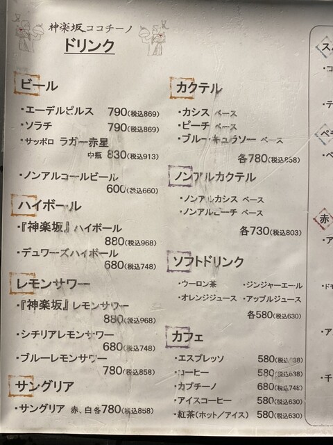お酒はビール、ハイボール、ワイン、スパークリングなど種類が充実していて、神楽坂レモンサワーは甘さ控えめでレモン感が強い