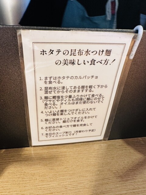 YouTubeで店主のインタビューを見ると、つけ麺黒[醤油]とつけ麺白[塩]があるが、お客さんが選ぶ割合は半々らしい。黒は昆布水とのバランス感を考えて和食感が強く、白はよりほたて感が感じられる味わいらしい。