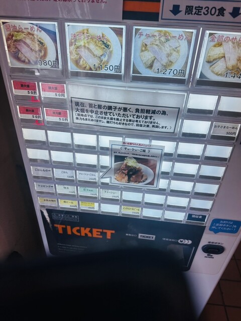 まずは券売機で全部のせラーメン1,440円、チャーシューごはん250円を購入。カウンターで店主に食券を渡す際に麺量を並(150g)か中(200g)で聞かれるので、中で注文した。