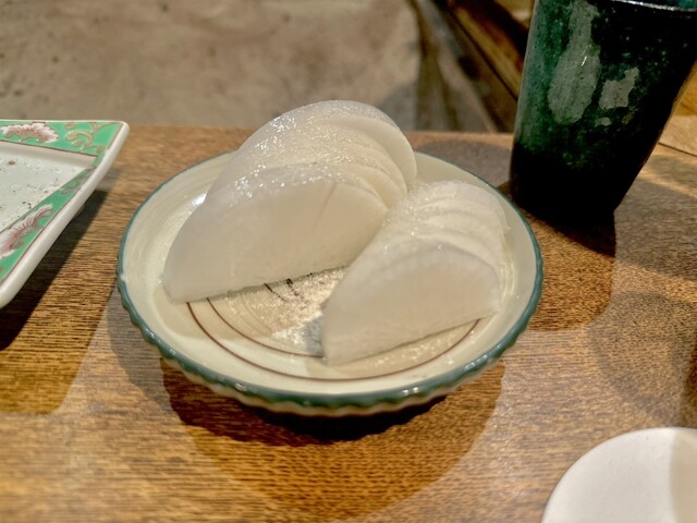 お漬物ではなく、シンプルに大根を塩につけていただくもの。食べたことのないくらい、とてもみずみずしく、甘味もあって、お肉料理が続く中での口直しにピッタリ。