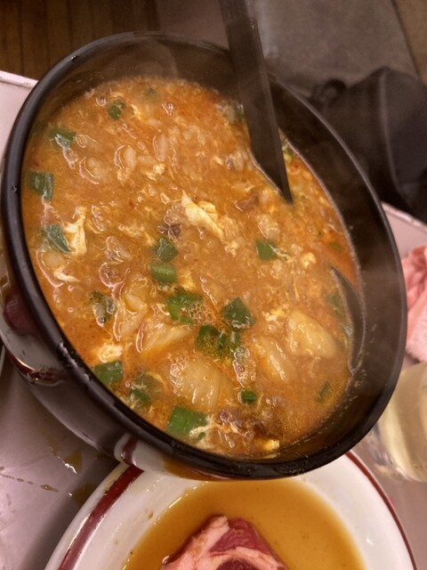 相変わらず一品頼むと野菜一皿が来るので、ヘルシーでとても有難いですが、途中でどの肉の分の野菜か分からなくなってきます。まずナムル盛り合わせでお酒を美味しく頂き、ラム、マトンを注文。ラムは柔らかく、マトンは濃い感じで本当に美味しいですね。げんらいサラダでバランスを取って、ラムの骨付き、ラム肩ロース、ラムタンを発注。骨付きは食べ応えがあり、肩ロースは赤身しっかり、タンは弾力ありで、それぞれ美味しい。締めに私と妻と息子はキムチぞうすいをシェア、娘は辛いものが苦手なので、和風ぞうすいを注文。どちらもスープに深みがあり、美味しいです。20年位板橋に住み、今まで気づきませんでしたが、この半年で2回訪問。かなりリーズナブルでリピートしたくなるお店です。最後にお互い勝手に抱負を言い合い、楽しい一時となりました。