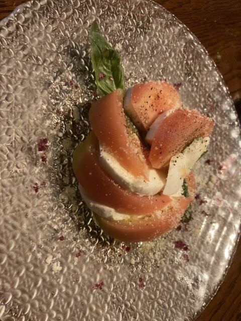 翌日より家族旅行で6:45羽田発の飛行機のため、早起きが大変との家族全員の要請を受け、近場に前泊することに。夕食の店を食べログで探し、家族が喜びそうな当店を予約し訪問。お通しは蒸し鶏のトマトソース、サーモンのカルパッチョで、どちらも美味しく、この先期待させる感じです。鶏レバー刺しは柔らかく、低温調理のため、レバーが苦手な方には最後に少し焼いた時の臭みを感じるようですが、相当食べやすいと思います。木の子のマリネはしっかりときのこが沢山入っており、美味しいです。砂肝とアスパラ、プチトマトのアヒージョはアスパラが沢山入り、バゲット追加で旨味の染み込んだオリーブオイルと一緒に食べられ、美味しいです。ピザはビスマルクを注文、生地がしっかりしていて具も多く美味しいのと、ガーリックチリオイルをかけると更に美味しく、他の料理にも合い、とても気に入りましたが、ピザが終わると片付けられてしまうので、注意が必要です。若鶏の丸々素揚げネギソース添えは皮パリパリで、身はしっとり美味しく、ネギソースも合っています。パスタは大葉のジェノベーゼを頼みましたが、パスタは平打ち気味でコシしっかりで、ソースが絡み美味しい。鶏ササミのタタキは非常に柔らかく美味しいです。生ハム、カプレーゼもお酒に合い美味しいです。最後にズワイ蟹のトマトクリームパスタを注文。私も子供達も気になっており、頼んでしまいました。パスタは硬めで私好み、濃厚なソースが絡み、凄く美味しい。食べ物は何を食べても美味しかったですが、飲み物もワインが美味しく、更に良いと思ったのは自家製レモンサワーが凄く美味しかったことです。こちらもとても気に入りました。