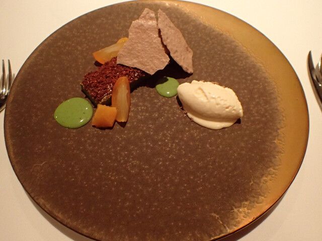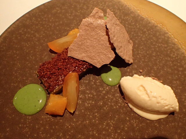 抹茶味の焼き菓子に黒七味のチョコレートムース、アーモンドのプラリネやチョコレートのクリーム、メレンゲなどが組み合わさったお菓子