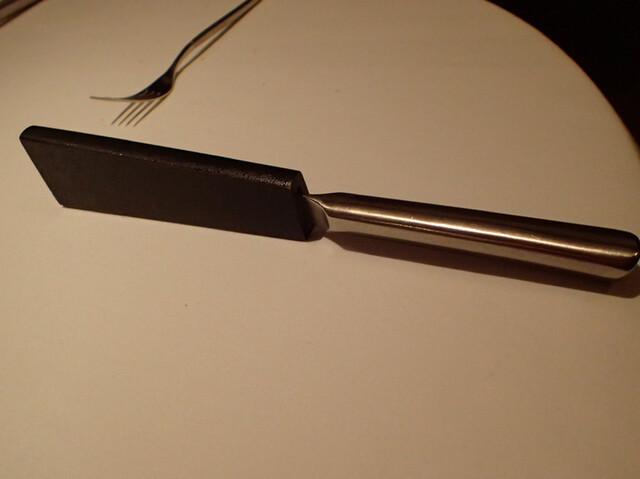 そしてメイン用のカトラリー登場。岐阜県関市のナイフに特注の鞘がついて登場!!びっくり。