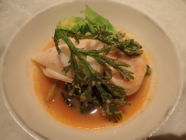ヤリイカは本当にフッワフワで幸せ。下に敷いてあるほうれん草が魚介の旨みを凝縮したスープを吸って美味しすぎる!パリパリ春菊も美味しい