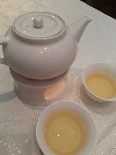 食後のデザートのアンニン豆腐と一緒に、サービスの温かい烏龍茶がポットで提供されます。