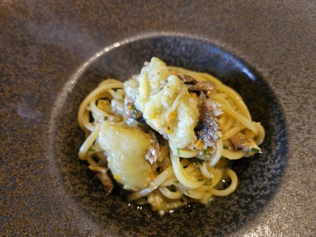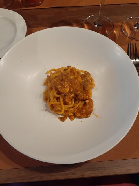 パスタは鰤の風味と食感がしっかりと感じられつつ濃厚なトマトソースが上手く調和しており、もちもちのロングパスタにもよく絡みました。