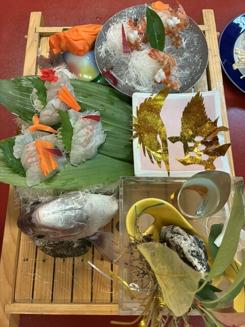 金色の鶴と亀の折り紙や人参で亀を作ってくれたり