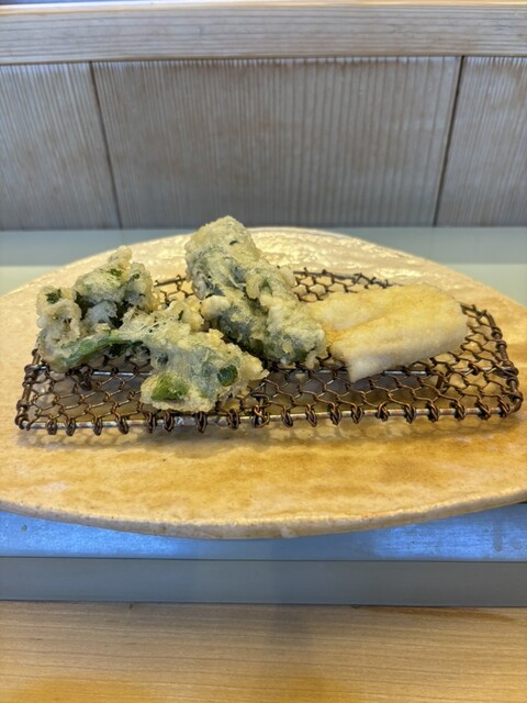 最後はかき揚げ 天ぷらは藻塩,ポン酢、天つゆ大根おろし付きの3択のお味でいただきます 赤だしには魚が入っていて生姜も効いているのでたまらなーい!どの器も素敵なので気持ちがいっそう盛り上がります