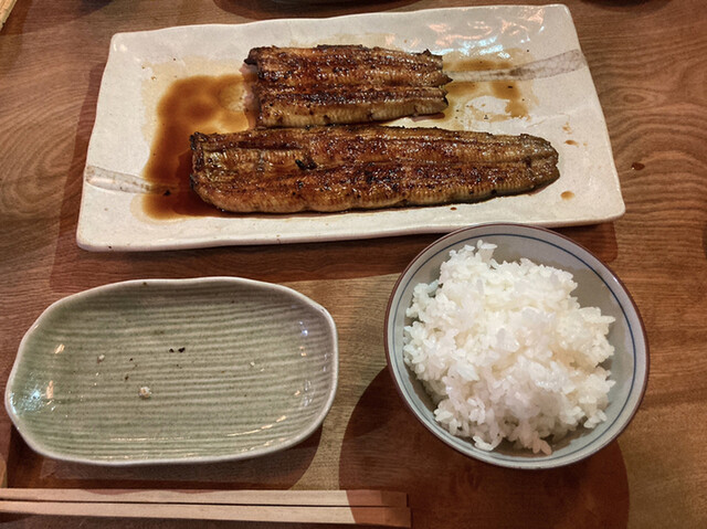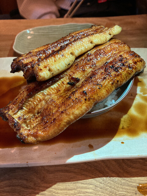 極圧の天然鰻と特上鰻重以上の長さの養殖鰻に、ご飯は中盛りを頼んだ。