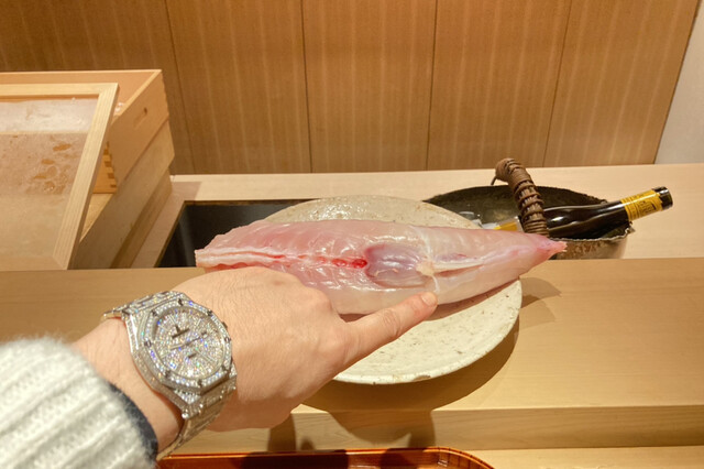 「じゃ今から切りますか」と目の前に、さわら。炙りますねっ、て。