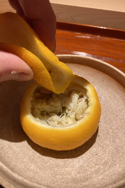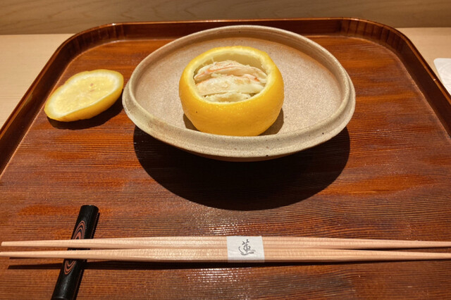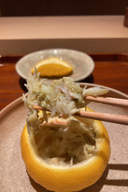蟹味噌と松葉蟹雄の肉を一口食べた後に、柚子を絞って下さいとの言葉通りに頂く。