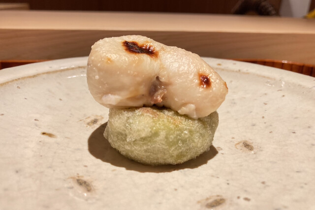 鹿児島の茅乃緑のそら豆すり身にしてじっくり蒸した傑作。その上にこんがり、ほんわかほっこりの白子。