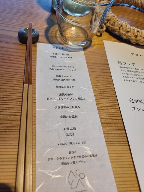 こちらのレストランACOYAは、福井市にあるフランス料理「cadre(カードル)」と銀座にあるモダンフレンチ「Air(エール)」を展開する林真史さんが、3店舗目として展開する食事とスイーツが楽しめるお店。