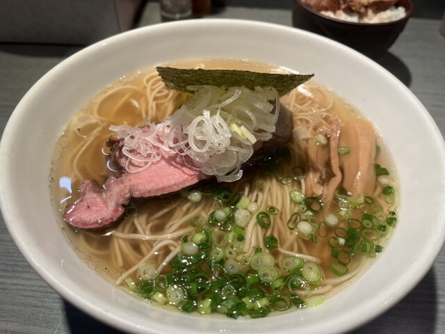 煮干蕎麦(塩)900円。大蒜辛肉飯200円。