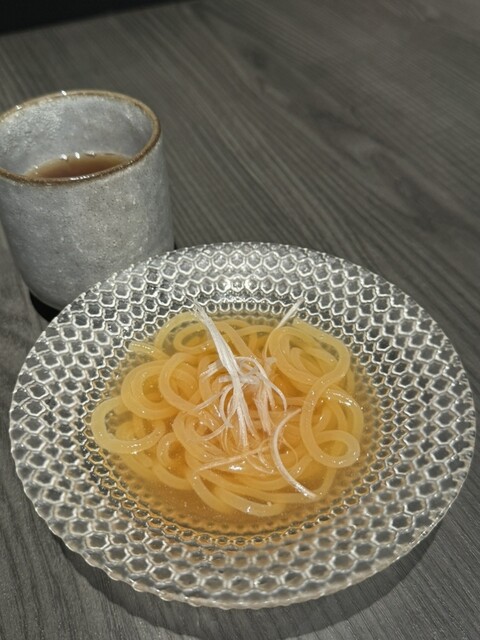 ユッケーキは、ねぎ塩、キャビア、和牛ユッケの3段に青森マッカランという卵黄が乗っています。これをバケットと海苔でいただきます。キャビアは高級感も含めて絶品でした。