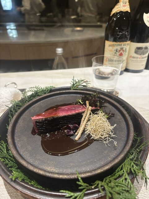じっくりとグリルされた銀の鴨はお皿の上で瞬間燻製して。添えられた牛蒡も味わい深い。イタリア野菜タルティーボのソース