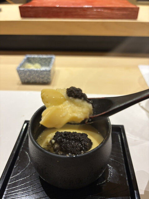 トリュフを削って叩いて茶碗蒸しの上に。少しチーズが入っていてリゾットの様にいただけます。とても贅沢な味わい。
