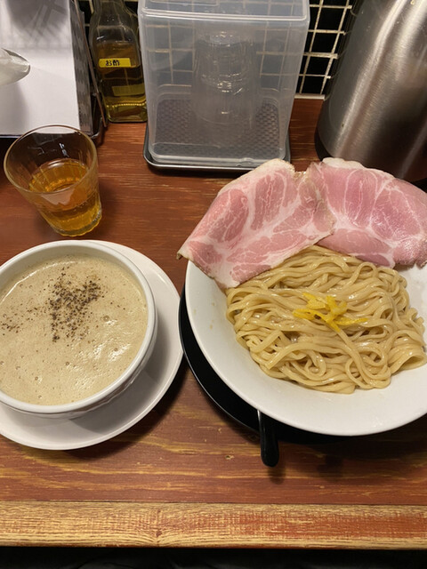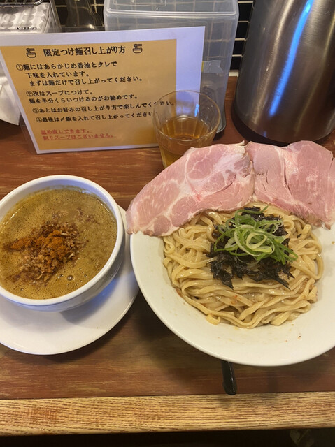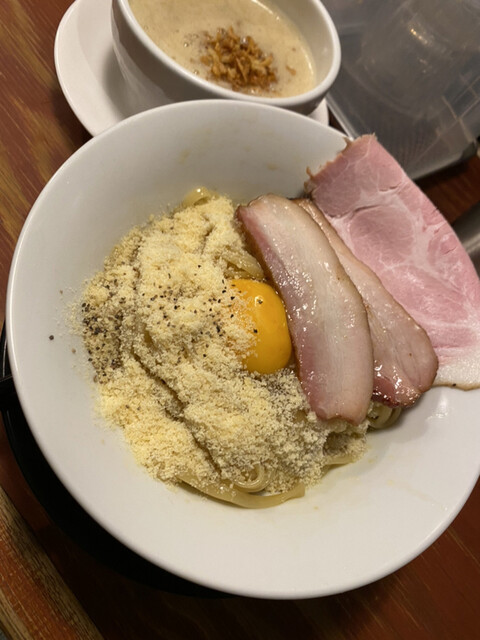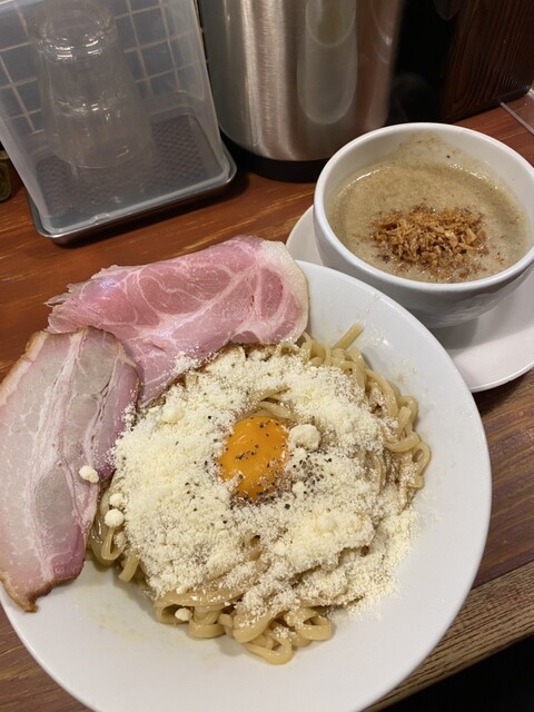 【限定】濃厚冷たいカルボナーラ白湯つけ麺(〆メシ付き)¥1200
