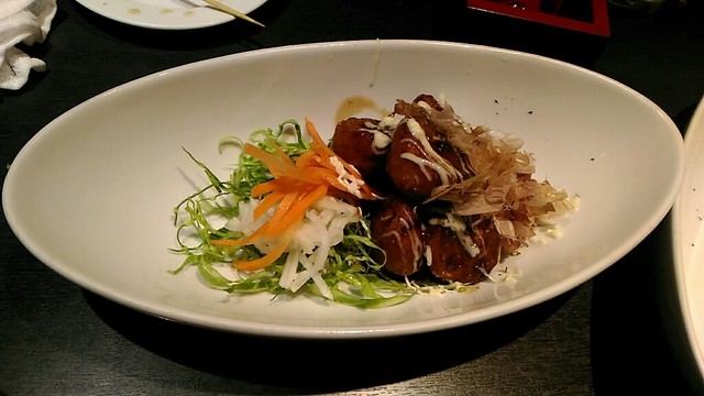 最後にたこ焼き。たこ焼きは冷凍?っぽいですが〆に良いですね。一緒にキャベツと紅ショウガが添えてあります。