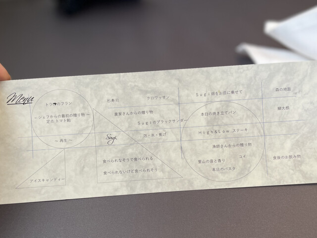 ここなんです、プレゼンテスギさんの魅力は。一応メニュー表はいただけるのですが、提供される順番も分からなければ、どんなお料理が出てくるかもわからないワクワク感。