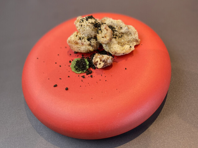 里山の音と香りも、シェフが山に入って歩いた際に聞こえてくる、落ち葉を踏んだ時の音を食べる側にも楽しんでほしいという思いが込められている。パリパリに手で砕いて音も一緒に楽しみました。