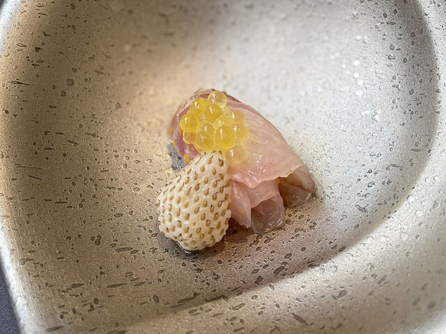 スズキのカルパッチョはオリーブオイルの人口いくら、また赤くなる前の若い苺のピクルスと一緒に。
