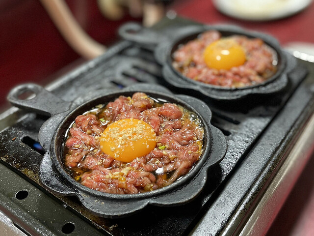 ユッケは、細切りにされたリブロースを卵黄と和え焼きするスタイル。いつも直ぐに火からあげていたけど、卵が固まるくらいよく混ぜながら火を通すと、お肉の甘みも出てよかった。