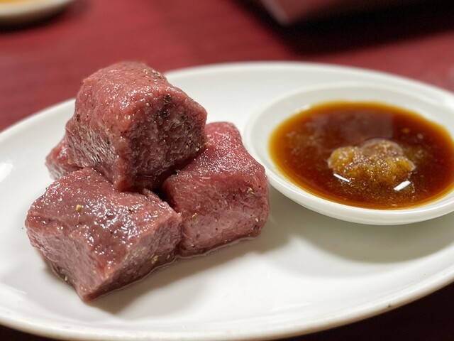 赤身角切りは、レアで。ヒレステーキとユッケの間のような味わいと柔らかさ。にんにく醤油でいただくのですが、そのままでお肉の味を楽しむのも好き。