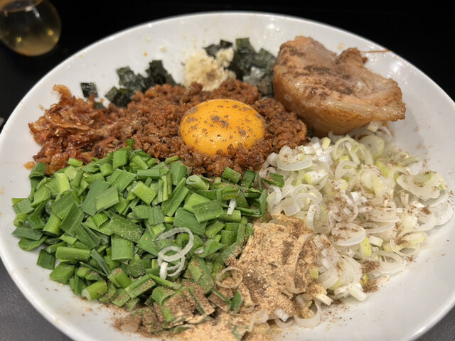 限定『青とうがら酢 冷やし汁無し』(1,200円)+燻製うずら(150円)+ショウガ(50円)+辛ニラ(100円)、ニンニクコール