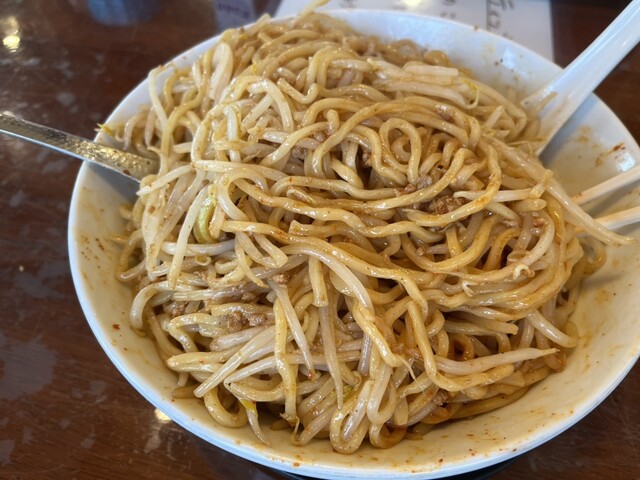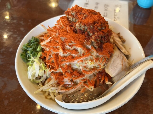 辛いまぜそば大盛。本当は辛いつけ麺を食べたかったが売り切れとの事。ただ、辛いまぜそばもかなりの美味さ。嫁は醤油ラーメン大盛を注文。