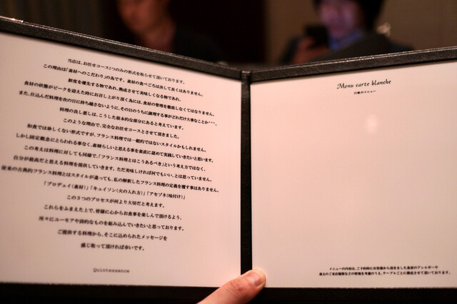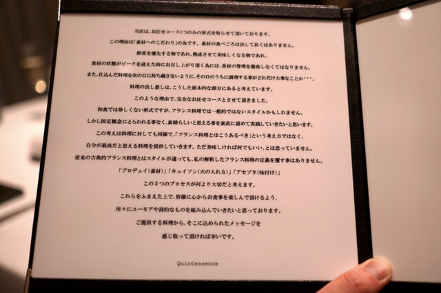 店名でもある『Quintessence(カンテサンス)』とは、フランス語で"物事の本質"や"真髄"という意味があるのだとか。そのため、本質的な料理を提供すべく、その時に最高な食材を、最高な状態で楽しんでいただきたいという想いが込められているように感じます。⠀