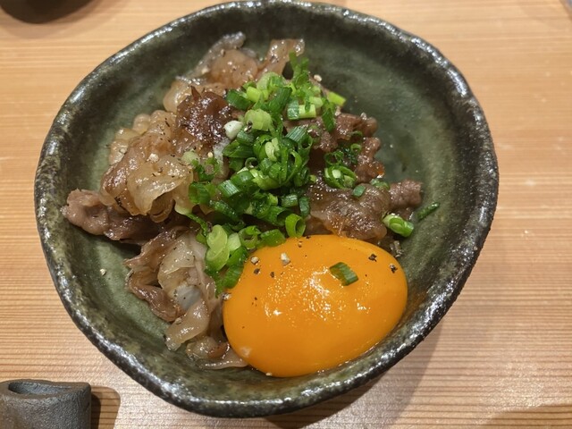 ◾️和牛すき焼き風 和牛はジューシーで甘味が強くそこにすき焼き風のタレと黄身が乗る、まさに王者の雰囲気を醸し出す。そこに日本酒を組み合わせる極上のひと時を生み出す。
