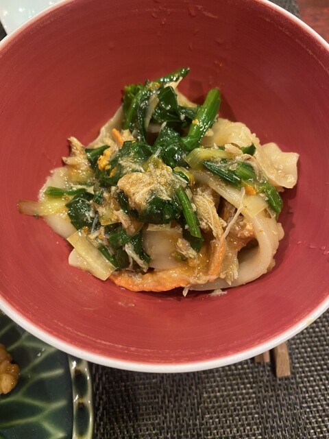 ◾️上海蟹とずわい蟹の刀削麺 麺に蟹のエキスが染み込む。不揃いの太面を啜ると心地よい弾力と蟹の旨味に圧倒される。素晴らしい逸品。