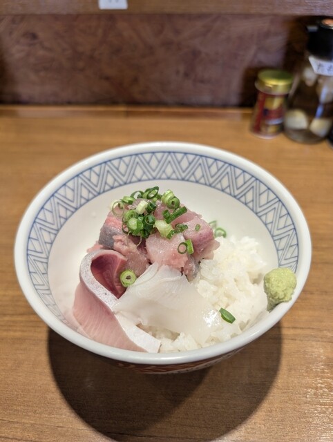 最初に海鮮丼が来ました。ハマチなどの刺身の下にネギとろが忍ばせてあり、刺身・ネギとろ・ご飯を一緒に食べると至福です✨