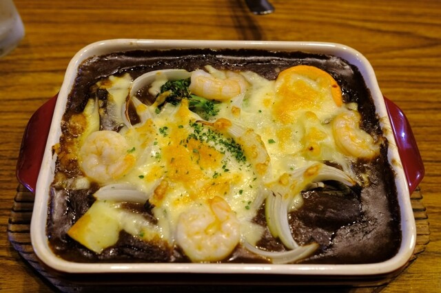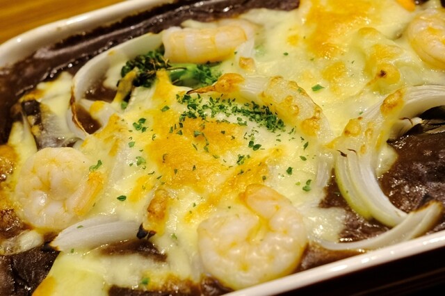 エビと3日熟成ルーの焼きカレー スープ、サラダ、飲み物付き950円