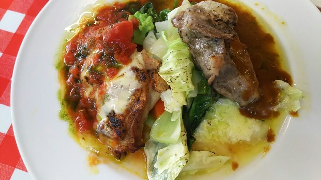 Aランチサラダ、スープ、パンorライス、メイン、ドリンク(1100円)この日のメインはチキンのトマトソースと豚ロース!