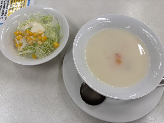 フレンチドレッシングの普通のサラダ、しかし、このスープはなんだろぅ❓どうにも形容しがたいお味…他の方が謎スープって書いてるけど、まさにそんな感じ(笑)