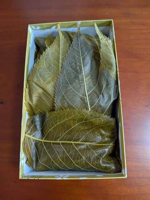 帰宅してすぐ頂く。箱の蓋を開けると桜葉のいい香りが鼻をくすぐる。桜葉は大きな立派な葉を3枚も使ってる。店の案内では桜葉を外して食べることを勧めているが最初はそのまま食べてみる。先ず桜葉の香りと塩味がずんと来てから程よい甘さの餡と柔らかいもち(小麦粉を使ってるので餅のような弾力のらある食感ではない)がいい具合に口に広がる。2個目はお勧めのように葉を外して食べてみる。桜葉の香りはちゃんとついていてとても品の良いおいしい味がする。3個目は両方の食べ方でゆっくり味わいながら頂いた。