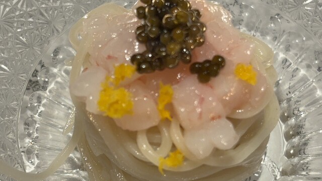 3ヶ月ごとに予約ができるので3ヶ月ごとに通うのを楽しみにしています。今回も筍の唐揚げや菜の花といった春の味覚と、まだ残る寒さを温めるちぢみほうれん草の料理など、三寒四温の2月をコースで楽しみます。塩水雲丹とずわい蟹の手巻き、甘エビとキャビアの乗った更科蕎麦は、海産物好きには堪りません。