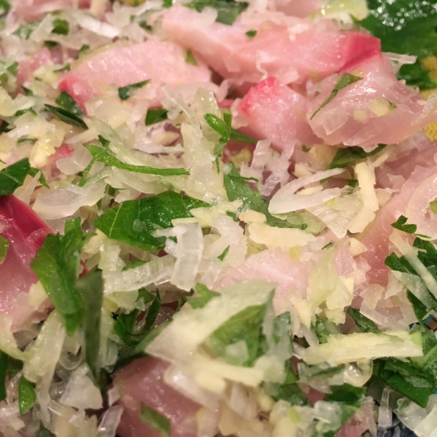 生さばのたたき。炙る方のたたきではなく、混ぜる方のたたき。そして透明なアオリイカ。解禁したての新酒。地酒の手取川。