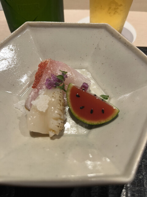 普通はアテから始まって最後にお寿司なのですが、途中にもお寿司がはさまります。
